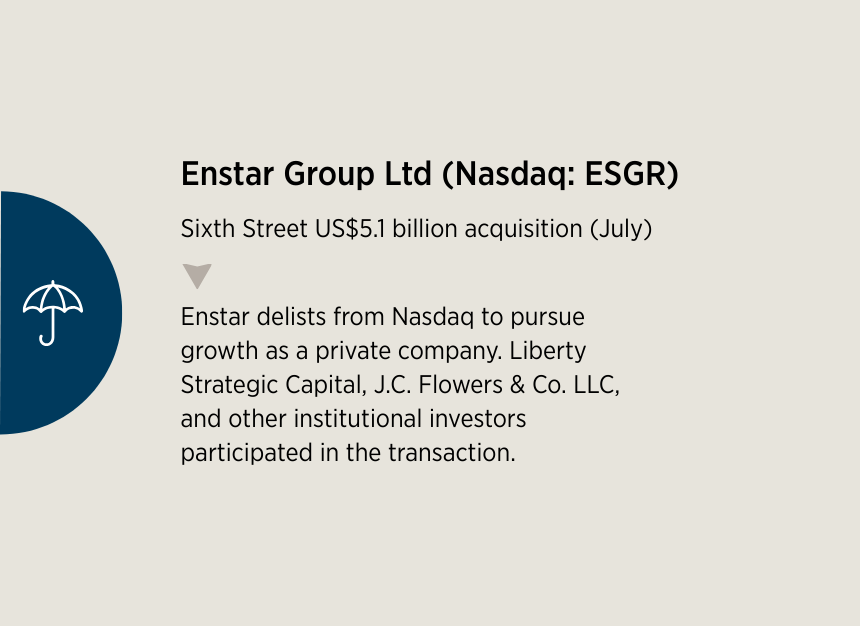 For Bermuda-listed companies, the re/insurance market recorded two significant transactions in 2025. The US$7 billion acquisition of Convex Group by Onex Corporation (Nasdaq: (ONEXF) and American International Group (NYSE: AIG) stands out as a landmark deal. Under the terms of the agreement, Onex will acquire approximately 63% of Convex, while AIG will take a 35% equity stake, becoming a strategic minority investor.